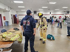Firefighter/EMT Thomas Chrisman helps students try on firefighter gear.