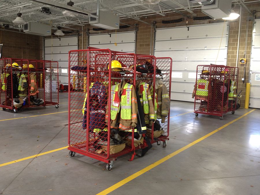 Fire turn out gear racks at Station 2. Each fire fighter has their own equipment rack containing their helmet, boots and coat.
