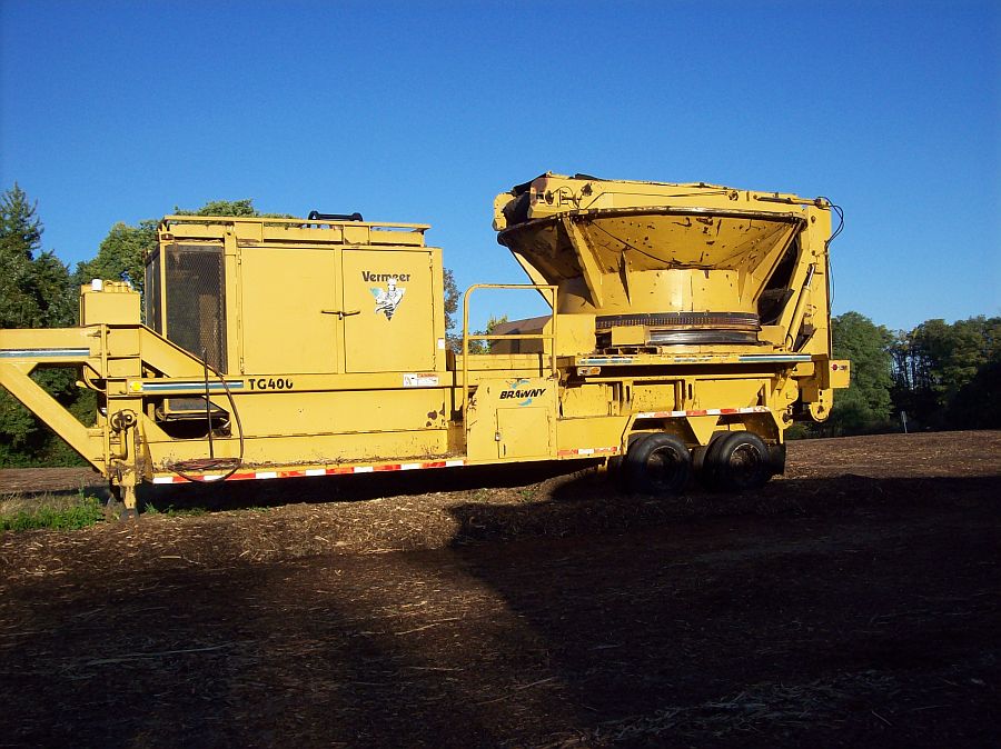 This 400 HP, diesel-powered, 12 foot Tub Grinder is used to create mulch. Tree limbs, brush, etc. are no match for this powerful grinder.